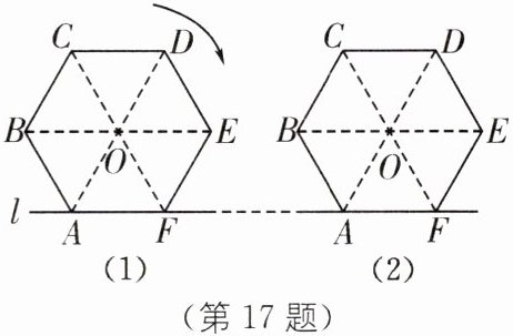 17. 如图,正六边形硬纸片$ ABCDEF $在桌面上由图(1)的起始位置沿直线$ l $不滑行地翻滚一周后到图(2)位置,若正六边形的边长为 2 cm,求正六边形的中心$ O $运动的路程.