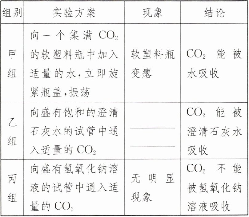 |$CO_2 $能被澄清石灰水吸收||丙组|向盛有氢氧化钠溶液的试管中通入适量的$ CO_2$|无明显现象|$CO_2 $不能被氢氧化钠溶液吸收|