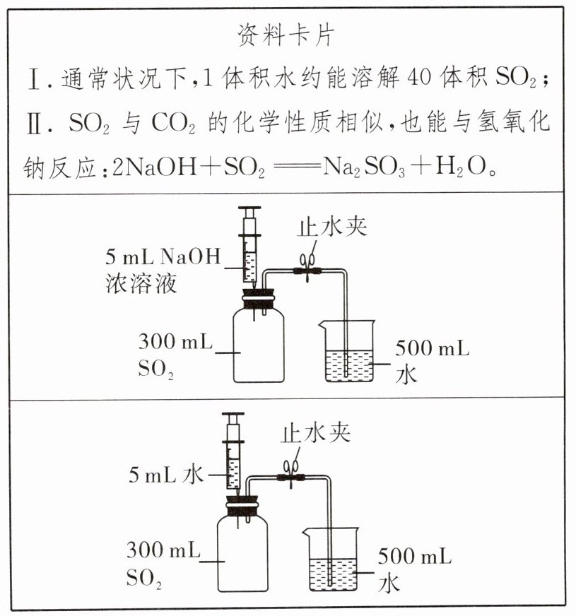 【迁移应用$】SO_2 $气体排放到空气中也会造成环境问题。同学们查阅资料,并利用如图所示装置进行实验,比较氢氧化钠浓溶液、水吸收$ SO_2 $的效果。