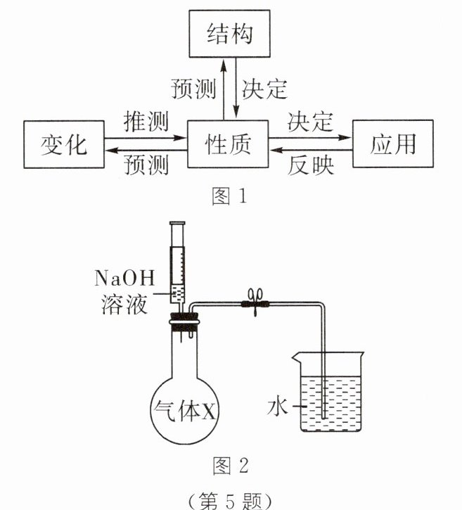 5.D [解析]气体X能与氢氧化钠反应,且不产生其他气体,装置内气压减小。从变化看,烧杯中的水会倒流至烧瓶中,A正确;从性质看,气体X可能会与Ca(OH)₂反应,B正确;从结构看,气体有可能是二氧化碳气体,C正确;气体X能与氢氧化钠反应,从应用看,不能用氢氧化钠固体干燥气体X,D错误。