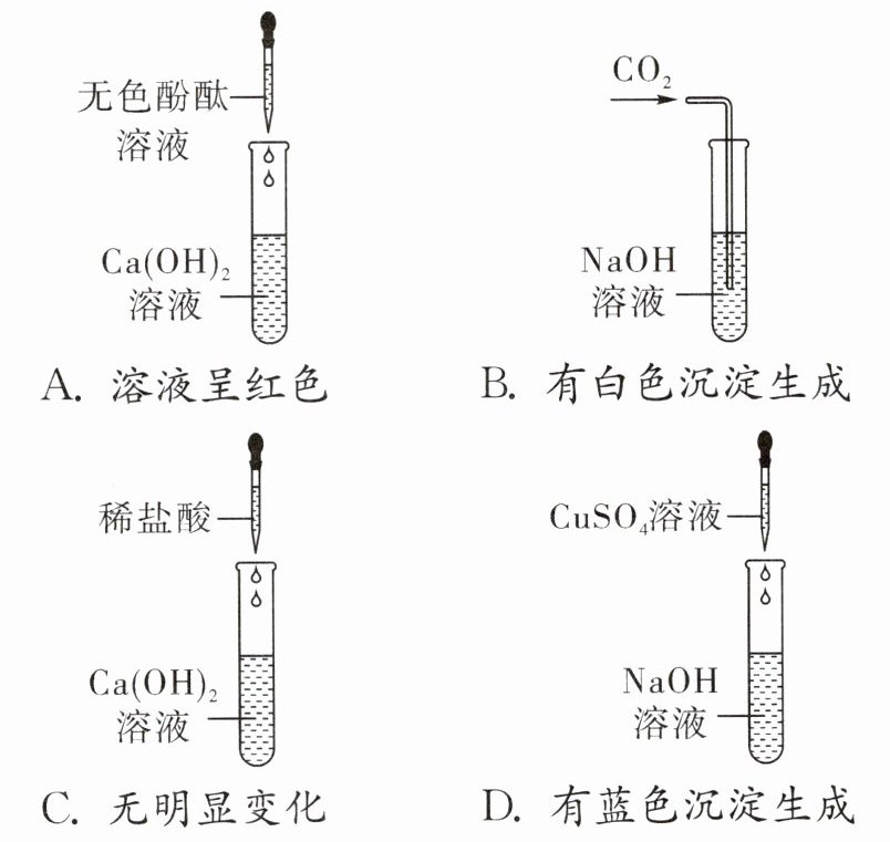 3.B [解析]氢氧化钙溶液显碱性,能使无色酚酞溶液变红色,A正确;二氧化碳和氢氧化钠溶液反应生成碳酸钠和水,无明显现象,B错误;稀盐酸和氢氧化钙溶液反应生成氯化钙和水,无明显现象,C正确;硫酸铜溶液和氢氧化钠溶液反应生成氢氧化铜沉淀和硫酸钠,有蓝色沉淀生成,D正确。