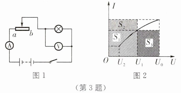 3. 跨学科 运用伏安图解法计算动态电路中的电功率 (2024·绍兴诸暨二模)图像是表征事物的一种方法。小明用如图 1 所示电路测定小灯泡的电功率,将滑片从 b 移至 a,记录多组数据并描绘出如图 2 所示的 I-U 图像。若图中面积$ S_1 $表示灯泡两端电压为$ U_1 $时消耗的电功率大小,则此时滑动变阻器所消耗的电功率可表示为(