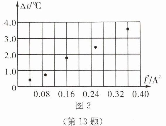 (2)根据Q吸=cmΔt可知,煤油的比热容一定,质量不变,因此煤油吸收的热量与其温度的变化量Δt成正比;根据焦耳定律可知,在电阻和通电时间一定时,电流通过导体产生的热量与I²成正比,由此可知,Δt与I²应成正比例关系,其图像应为一条过原点的直线,由于存在实验误差,则图像如答图所示。