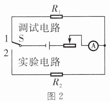 如图 2 所示的电路包含调试电路和实验电路,$R_{1}和R_{2}$是阻值都为 20 Ω的电热丝,$R_{2}$放置在装有煤油的保温容器中。实验中先使用调试电路进行调试,使电热丝$R_{2}$在调试过程中不发热。实验步骤如下。