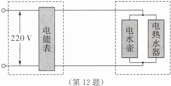 12. (2024·呼伦贝尔中考)如图所示,电水壶的规格为“220 V 1210 W”、电热水器的规格为“220 V 2420 W”、电能表上标着“3000 revs/(kW·h)”字样。当电路中单独使用电水壶烧水时,铝盘转动 165 转,用时 180 s;在电路中单独使用电热水器时,用时 6 min。导线、电水壶和电热水器的电阻不随温度变化。求: