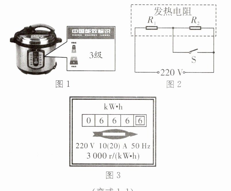 变式1.1 如图1所示为小明家的电饭锅,铭牌上附有中国能效标识,从铭牌上可知该电饭锅能效等级为三级,额定电压为220 V,加热功率为1210 W。电饭锅的简化电路图如图2所示,有加热和保温两挡,由开关S调节,其中$R_{1}和R_{2}$均为发热电阻,且阻值不随着温度的变化而改变。