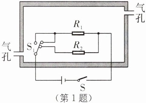 1. 恒温箱广泛应用于医疗、科研、化工等行业部门,如图所示为某恒温箱的工作原理图。S为电源开关,通过控制温控开关$S_{1}$可实现“保温”、“加热”两个挡位间的切换。电源电压$U= 220\ \text{V}$,$R_{1}$、$R_{2}$是电热丝,$R_{1}= 440\ \Omega$,“加热”时恒温箱的电功率$P_{加热}= 550\ \text{W}$。将恒温箱两气孔封闭,闭合开关S,$S_{1}$置于“加热”挡位,箱内温度从$20\ ^{\circ}\text{C}$升至设定的恒温温度,用时130 s,该段时间内的加热效率$\eta =80\%$。恒温箱的容积$V= 2\ \text{m}^{3}$,箱内空气密度$\rho =1.3\ \text{kg/m}^{3}$,箱内空气的比热容$c= 1.0× 10^{3}\ \text{J/(kg}\cdot^{\circ}\text{C)}$。求: