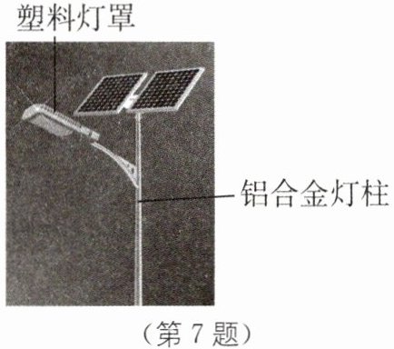 7. 如图所示是太阳能电池路灯,白天太阳能电池板将太阳能转化为电能,这种能量通过再次转化储存在大容量蓄电池内,夜晚蓄电池给路灯供电。下列说法正确的是(