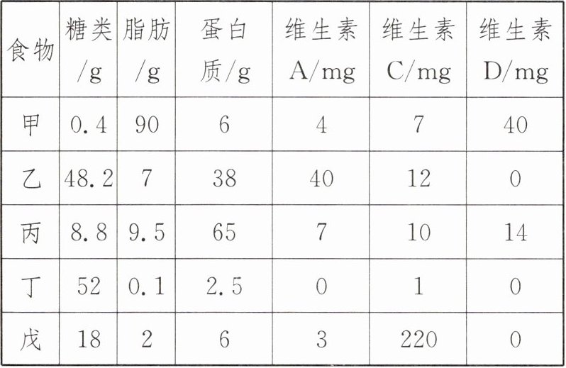 )。|食物|糖类/g|脂肪/g|蛋白质/g|维生素A/mg|维生素C/mg|维生素D/mg|