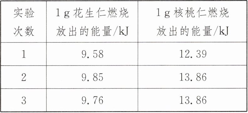 |实验次数|1g花生仁燃烧放出能量/kJ|g核桃仁燃烧放出能量/kJ|