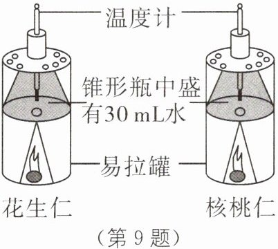 9.(2024·杭州育才中学月考)某兴趣小组的同学从"葡萄、花生仁、核桃仁、小西红柿"中选取"花生仁,核桃仁",按如下实验装置探究食物中储存的能量,重复三次,记录并计算,数据如表,请回答下列各题,