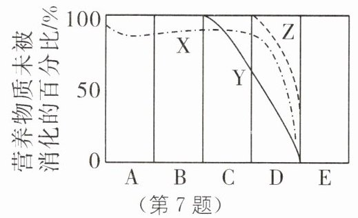 C [解析]消化道包括口腔、咽、食管、胃、小肠、大肠、肛门,横坐标表示消化道的组成,且由题图可推断,A表示口腔,C表示胃,D表示小肠,A正确。部分淀粉在口腔内被唾液淀粉酶分解成了麦芽糖,淀粉和麦芽糖在小肠中被肠液、胰液分解为葡萄糖。X在口腔内开始消化,因此,X表示淀粉的消化过程,最终消化产物是葡萄糖,B正确。蛋白质在胃中开始被消化,在胃蛋白酶 的作用下被初步消化,然后进入小肠,在小肠中肠液和胰液中酶 的作用下被分解成氨基酸。Y在胃内被初步消化,因此,Y表示蛋白质 的消化过程,胃蛋白酶可将蛋白质分解为多肽,多肽继续在肠液和胰液的作用下被分解成氨基酸,C错误;脂肪的消化过程 在小肠内进行,脂肪先在胆汁的乳化下变为脂肪微粒,脂肪微粒在胰液和肠液作用下被彻底分解为甘油和脂肪酸,Z在小肠内被消化表示脂肪的消化过程,参与的消化液有胆汁、胰液和肠液,D正确。