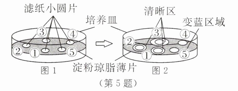 ①取5片大小相同的滤纸小圆片,编号为①~⑤号,将其分别在五种不同成分的溶液(各溶液成分如表)中浸泡后取出,按图1所示放置在盛有淀粉琼脂薄片的培养皿中,盖上盖子。