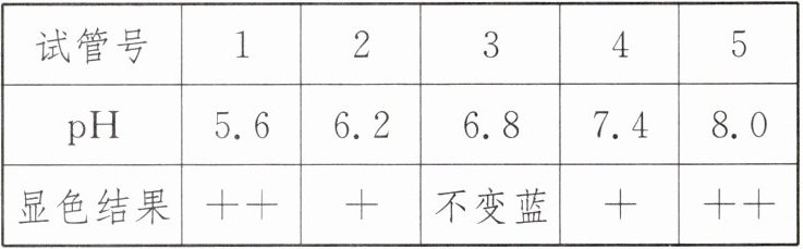 1. 小金为探究pH对人体唾液淀粉酶活性的影响,取5支试管分别装入2mL浓度相同但pH不同的淀粉糊,再分别加入1mL浓度相同的唾液,分别滴加等量碘液,5支试管的显色结果如下表("+"表示蓝色的程度),关于此实验,下列说法不正确的是(