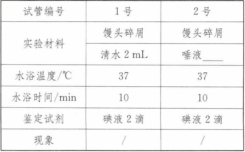|实验材料|馒头碎屑清水2mL|馒头碎屑唾液____|