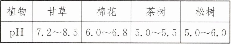 A [解析]甘草适宜生长的pH为7.2~8.5,可以在弱碱性土壤中生长,A正确;棉花适宜生长的pH为6.0~6.8,呈弱酸性,不适宜在弱碱性土壤中生长,B错误;茶树适宜生长的pH为5.0~5.5,呈酸性,不适宜在弱碱性土壤中生长,C错误;松树适宜生长的pH为5.0~6.0,呈弱酸性,不适宜在弱碱性土壤中生长,D错误。