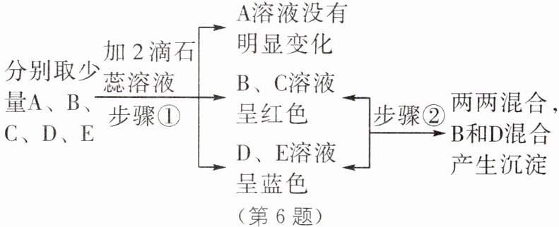 6.鉴别稀盐酸、稀硫酸、$Ba(OH)_2$溶液、$Na_2CO_3$溶液和NaCl溶液五瓶失去标签的溶液时,将它们随意编号为A~E后进行如下实验: