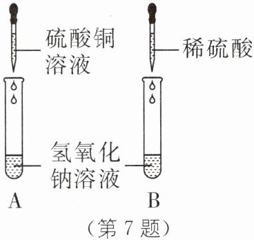 (1)硫酸铜溶液与氢氧化钠溶液反应生成氢氧化铜蓝色沉淀和硫酸钠,则 A 试管中观察到的实验现象是产生蓝色沉淀,该反应的化学方程式为 2NaOH + CuSO₄ = Cu(OH)₂↓ + Na₂SO₄。