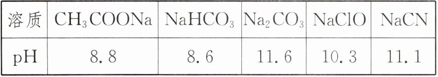 )。|溶质|${CH_{3}COONa}$|${NaHCO_{3}}$|${Na_{2}CO_{3}}$|${NaClO}$|${NaCN}$|