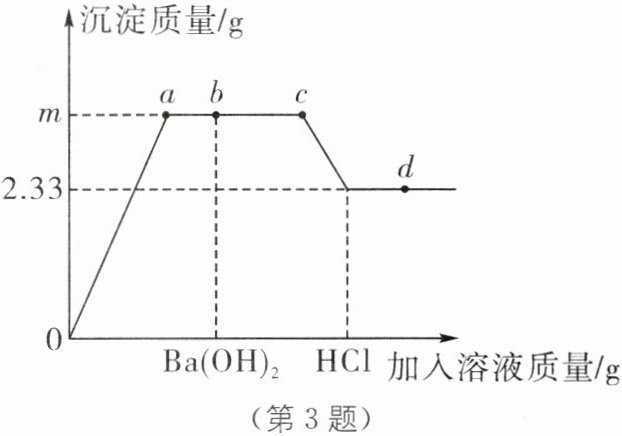 D [解析]根据图像可知,0~a段氢氧化钡和硫酸铜反应生成硫酸钡沉淀和氢氧化铜沉淀,因此溶液的导电性将逐渐减弱,A不符合题意;b点开始剩余的氢氧化钡以及生成的氢氧化铜开始和氯化氢反应,根据图像信息可知,氯化氢先和氢氧化钡反应,当反应完全后,氯化氢才和氢氧化铜反应,d点时氯化氢过量,所以此时溶液中的溶质为氯化钡、氯化铜和氯化氢,对应的化学式为BaCl₂、CuCl₂、HCl,B不符合题意;b~c段发生的反应是氢氧化钡和氯化氢反应生成氯化钡和水,该反应的化学方程式为2HCl+Ba(OH)₂BaCl₂+2H₂O,C不符合题意;由图像数据可知,生成硫酸钡沉淀的质量为2.33g,设生成氢氧化铜沉淀的质量为xg,Ba(OH)₂+CuSO₄Cu(OH)₂↓+BaSO₄↓98 233xg 2.33g98/233=xg/2.33g,x=0.98,所以m=2.33+0.98=3.31,D符合题意。
