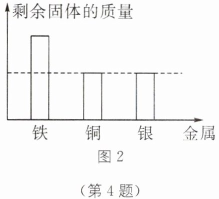4.(2025·湖州吴兴区期中)在学习金属相关知识时,小科向盛有硝酸银和硝酸铜混合溶液的烧杯中加入一定质量的铁粉,充分反应后烧杯内剩余固体的质量如图。则下列推断正确的是(