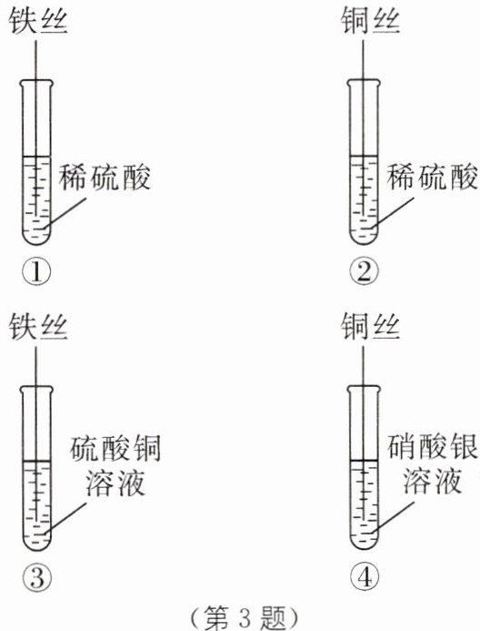 (2)实验③中铁与硫酸铜反应生成硫酸亚铁和铜,反应的化学方程式为Fe+CuSO₄=FeSO₄+Cu。