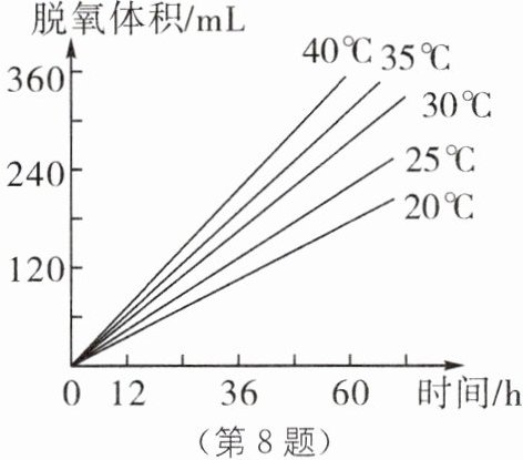 。(4)上图为一种铁系脱氧剂(质量为5g),分别在20℃、25℃、30℃、35℃、40℃下每隔12h测量其脱氧效果,对比图中的五条曲线,得出的结论是