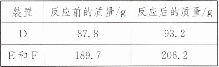 (3)装置 D 中浓硫酸吸收生成的水,装置增加质量就是生成水的质量:$93.2\ \text{g}-87.8\ \text{g}=5.4\ \text{g}$;装置 E、F 可以吸收生成的二氧化碳气体及从装置 E 的气流中带出来的少量水蒸气,装置 E 和 F 增加的总质量就是生成二氧化碳的质量:$206.2\ \text{g}-189.7\ \text{g}=16.5\ \text{g}$;反应前后元素种类质量不变,双氢青蒿素中碳、氢质量等于生成二氧化碳、水中碳、氢元素质量,分别为$16.5\ \text{g}× \frac{12}{44}× 100\%=4.5\ \text{g}$、$5.4\ \text{g}× \frac{2}{18}× 100\%=0.6\ \text{g}$,则 7.1 g 双氢青蒿素中氧元素质量为$7.1\ \text{g}-4.5\ \text{g}-0.6\ \text{g}=2\ \text{g}$,双氢青蒿素中碳、氢、氧三种元素的质量比是$45:6:20$。