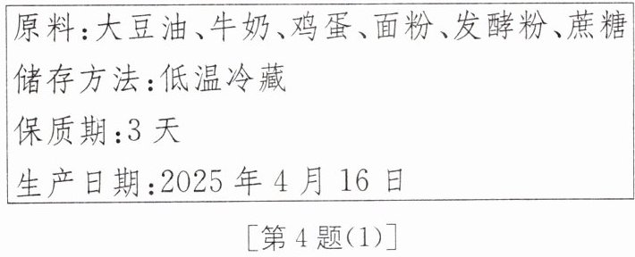 (任写两种)。|原料:大豆油、牛奶、鸡蛋、面粉、发酵粉、蔗糖|