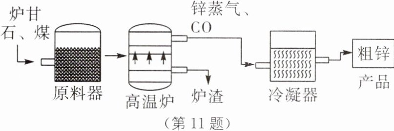 11. 中考新考法 《天工开物》 (2024·山西中考)我国是世界上锌冶炼最早的国家。明代宋应星所著的《天工开物》中有关"火法"炼锌的工艺记载是"每炉甘石(主要成分是碳酸锌)十斤装载入一泥罐内……然后逐层用煤炭饼(反应后生成一氧化碳)垫盛,其底铺薪,发火煅红……冷定毁罐取出……即倭铅(锌)也。"此工艺过程分解模拟如图。(已知:Zn 的冶炼温度为 904℃,Zn 的沸点为 906℃。)请结合图文信息,分析思考,解决问题: