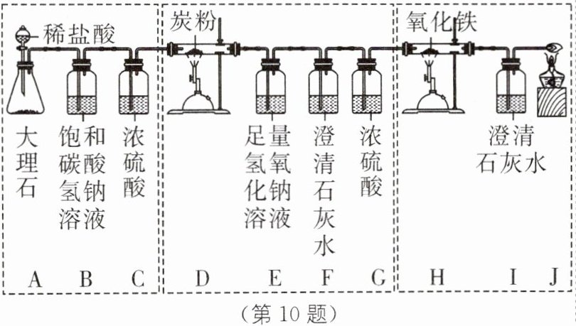 (5)处理尾气,防止一氧化碳污染空气 [解析]盐酸具有挥发性,A中产生的气体是二氧化碳、氯化氢和水蒸气,B装置中的碳酸氢钠能吸收氯化氢,浓硫酸具有吸水性且不与二氧化碳反应,C装置中浓硫酸能吸收水蒸气;D装置发生的反应是碳与二氧化碳在高温条件下生成一氧化碳,氢氧化钠与二氧化碳反应生成碳酸钠和水,E装置能吸收没有参加反应的二氧化碳,二氧化碳能与澄清石灰水中的氢氧化钙反应生成碳酸钙沉淀和水,F装置能检验二氧化碳是否完全除尽,G装置中浓硫酸能吸收水蒸气;H装置中一氧化碳与氧化铁在高温条件下生成铁和二氧化碳,二氧化碳能与澄清石灰水中的氢氧化钙反应生成碳酸钙沉淀和水,I装置能检验二氧化碳,一氧化碳具有可燃性,J装置用于处理尾气,防止一氧化碳污染空气。