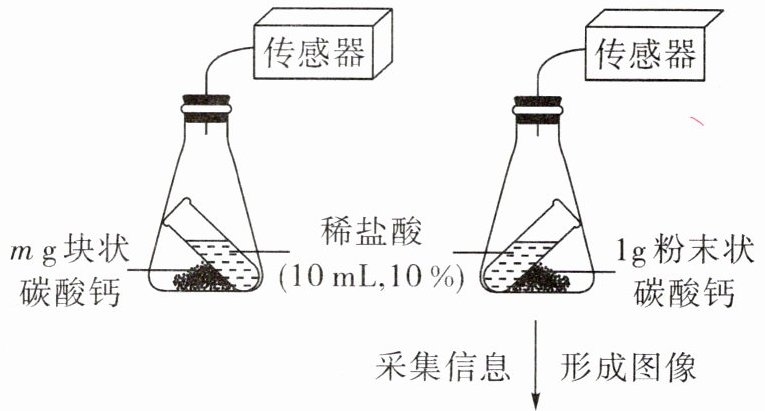 B [解析]除探究要素不同之外,其他条件都应该是相同的,则 m=1,A 正确;d 点石灰石中的碳酸钙还没有完全反应,稀盐酸有剩余,溶液中溶质为 CaCl₂、HCl,B 错误;对比分析 a、c 点可知,反应到相同的压强时,a 所需的时间短;对比 b、d 点可知,单位时间内粉末状碳酸钙的容器内压强大,说明粉末状碳酸钙反应更快,C 正确;t s 时粉末状碳酸钙的容器内压强大,说明粉末状碳酸钙与稀盐酸反应产生的二氧化碳更多,D 正确。