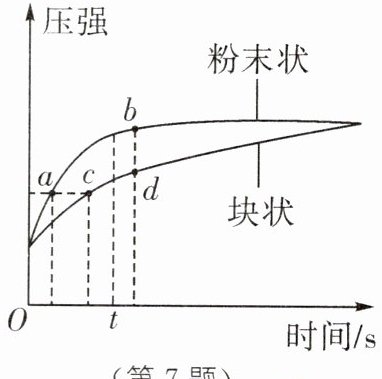 7. 利用数据传感技术比较块状和粉末状的碳酸钙与足量稀盐酸反应的快慢。按如图装置进行实验,倾斜锥形瓶,使 10 mL 稀盐酸与固体充分接触,瓶内压强随时间的变化如图。下列有关说法不正确的是(