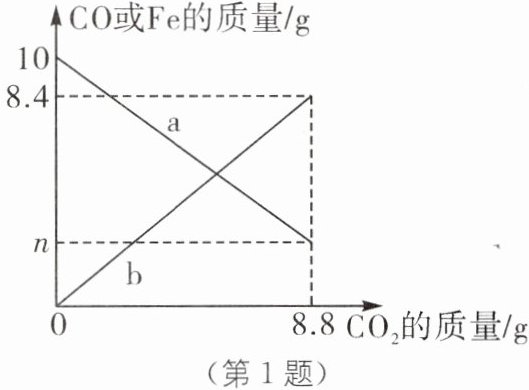 1.(2024·乐山中考)铁有多种氧化物,为探究其中一种氧化物${Fe_{x}O_{y}}$的组成,某同学将$m\ \text{g}\ {Fe_{x}O_{y}}和10\ \text{g}\ {CO}$置于密闭容器中在高温下发生反应。反应开始至某时刻,测得容器中部分物质的质量变化关系如图所示。下列说法正确的是(