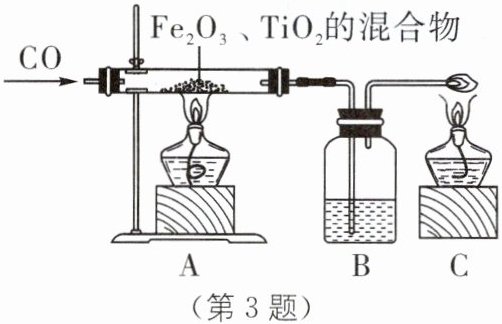。(2)现利用${CO}来还原{TiO_{2}}$、${Fe_{2}O_{3}}$的混合物提炼单质钛和铁,装置如图所示,就实验操作顺序的问题,两位同学出现了分歧。小月认为先通一段时间${CO}$以排空装置内空气,然后再点燃C和A处的酒精灯,小亮认为这样做不好;小亮认为先点燃C和A处的酒精灯,然后再通${CO}$,小月又提出反对。老师认为他们的操作都有一定道理,请你帮助这两位同学解决他们的困难,你的办法是______