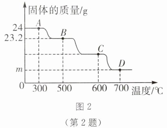 2. 用图1装置还原{Fe_{2}O_{3}}的过程中,常常先生成{Fe_{3}O_{4}},后生成{FeO},最后生成{Fe}。现实验室用{CO}还原$24\ \text{g}\ {Fe_{2}O_{3}},$测得残留固体的质量随温度的变化如图2所示(图中各点对应固体均为纯净物)。下列说法不正确的是(