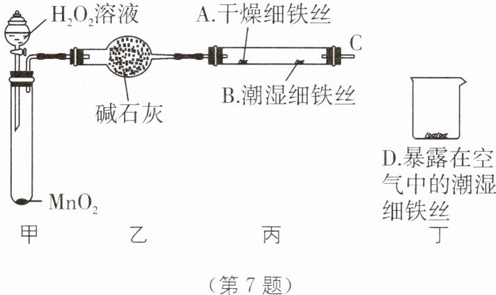 7. 下面是对铁的锈蚀条件的探究,课本实验中,铁生锈所需要时间较长,某实验小组设计如下改进实验(碱石灰能吸收水蒸气和二氧化碳)。