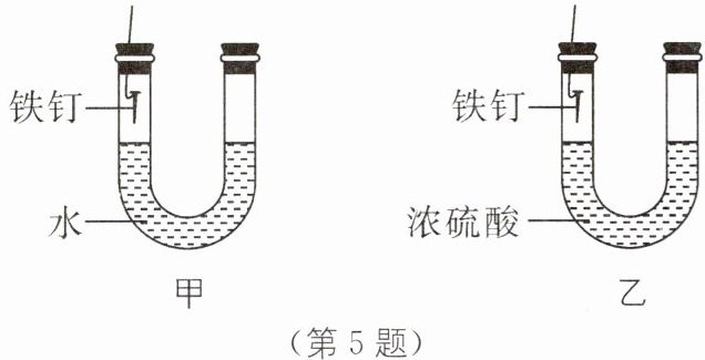 A [解析]装置甲中铁钉放在有水、氧气的空间中,容易发生锈蚀;浓硫酸具有吸水性,可以干燥气体,装置乙中铁钉放在了干燥的空气中,不易生锈,装置乙中铁钉几乎没有锈蚀,A正确,B错误;装置甲中铁钉这一侧氧气被消耗,气体压强减小,液面上升,C错误;装置乙中铁钉几乎没锈蚀,是因为浓硫酸能够吸收水蒸气,导致铁钉不能和水接触,因此铁钉这一侧液面基本没变化,D错误。