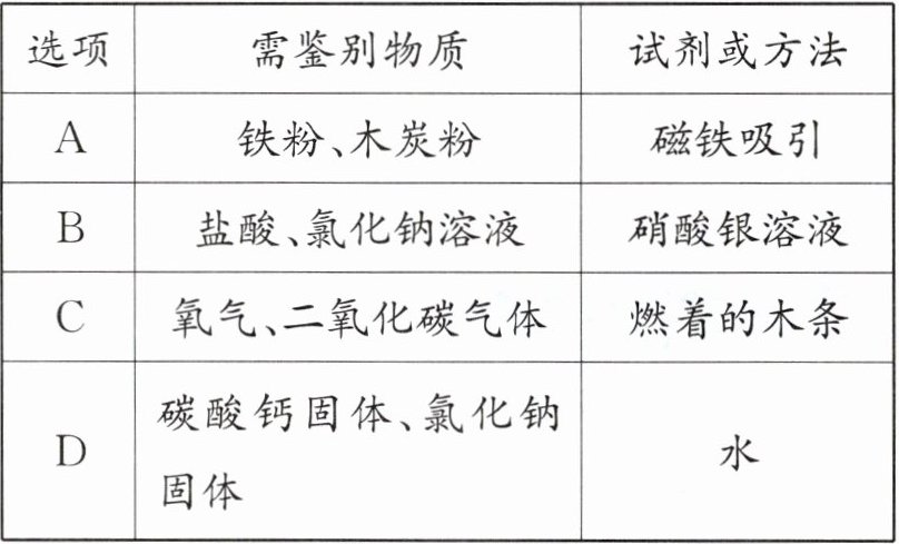 4.B [解析]鉴别铁粉、木炭粉:用磁铁吸引,铁粉能被磁铁吸引,木炭粉不可以,现象不同,可以鉴别,A不符合题意;鉴别盐酸、氯化钠溶液:加入硝酸银溶液,硝酸银与盐酸、氯化钠反应都能产生氯化银白色沉淀,现象相同,无法鉴别,B符合题意;氧气、二氧化碳气体:燃着的木条伸入氧气中燃烧得更旺,伸入二氧化碳中熄灭,现象不同,可以鉴别,C不符合题意;鉴别碳酸钙固体、氯化钠固体:碳酸钙不溶于水,氯化钠溶于水,现象不同,可以鉴别,D不符合题意。
