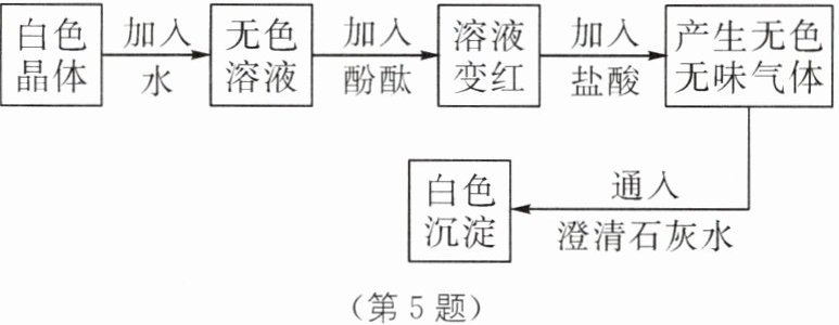 5.A [解析]根据图中信息可知白色晶体能溶于水;无色溶液加入酚酞变红色,说明白色晶体的水溶液显碱性,与盐酸反应生成的气体能使澄清石灰水变浑浊,说明白色晶体中含有碳酸根离子或碳酸氢根离子。碳酸钠溶液呈碱性,能与盐酸反应生成二氧化碳,故选A。