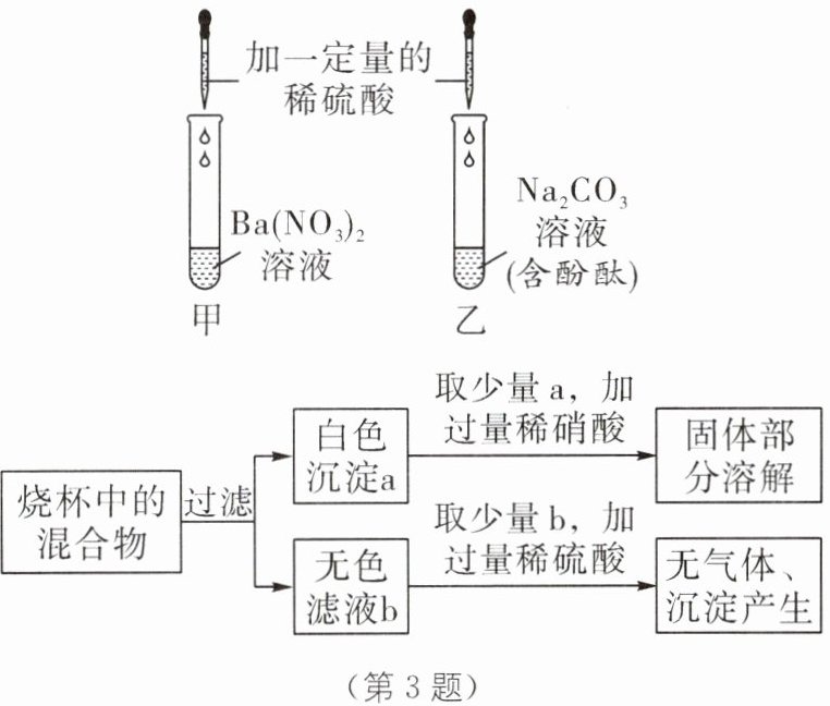 3.B [解析]取少量白色沉淀a,加过量稀硝酸,固体部分溶解,则白色沉淀a是硫酸钡、碳酸钡的混合物,说明甲试管中的硝酸钡溶液有剩余,乙试管中的碳酸钠溶液有剩余。取少量无色滤液b,加过量稀硫酸,无气体、沉淀产生,说明滤液b中无碳酸钠、无硝酸钡。加入一定量的稀硫酸,甲试管中产生白色沉淀,A错误;酚酞溶液遇碱性溶液变红,遇酸性、中性溶液不变色,由上述分析可知乙试管中碳酸钠溶液有剩余,碳酸钠溶液显碱性,能使酚酞溶液变红,所以乙试管溶液一定呈红色,B正确;酚酞溶液遇碱性溶液变红,遇酸性、中性溶液不变色,烧杯中无色滤液b不含酸物质,一定呈中性,C错误;白色沉淀a为硫酸钡沉淀、碳酸钡沉淀的混合物,D错误。