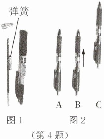 4. 把常用的按钮式圆珠笔笔尖朝上用力按下后放手,它会弹起很高。把它拆开后发现,它能弹起的原因是内部装有一根弹簧,如图1所示。小强仔细观察后发现,圆珠笔弹起的过程可以分为“A:按下后放手”到“B:获得一个向上的速度”再到“C:向上运动到达最高点”,如图2所示。圆珠笔在“A→B”阶段,