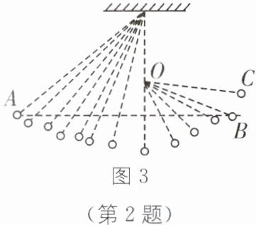 D [解析]①图1中无摩擦,机械能是守恒的,因此,小球从A点经B、C能滑到D,①正确,不符合题意;②图2中无摩擦,将细绳绕轴转到A点,放手后,滚摆能在上下来回转动,②正确,不符合题意;③图3中,将单摆从A点放手,能摆到B点,若在O点放一小棒,抵住细绳,小球仍只能摆到B点,而不可能上升到更高的C点,③错误,符合题意。故选D。