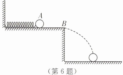 6. 小明同学用多个大小相同,质量不同的小球,做了如图所示实验:将弹簧一端固定在墙面,另一端自然伸长至A,压缩弹簧至同一位置静止释放不同小球,小球落地位置不同。若平面均光滑,下列说法正确的是(
