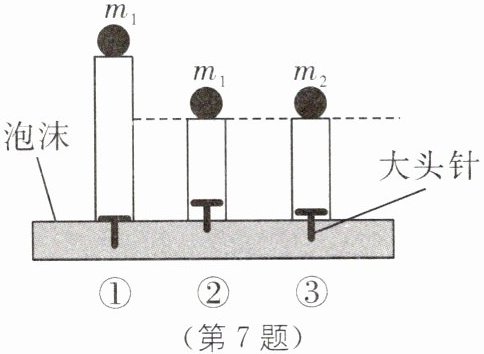 7. 转化法与控制变量法 小实利用空心塑料管、质量不同的小球$(m_1<m_2)、$大头针和泡沫来研究“影响重力势能大小的因素”。如图所示,他将小球放在塑料管正上方释放,观察大头针插入泡沫的深度,重复实验。下列说法错误的是(