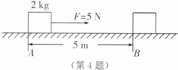 C [解析]如图所示,并不光滑的水平桌面上,质量为2 kg的物体在一水平力F的作用下向右做匀速直线运动,物体的质量和速度不变,物体动能不变,A错误;物体的重力G=mg=2 kg×10 N/kg=20 N,B错误;由图可知,物体移动的距离为5 m,力F做的功W=Fs=5 N×5 m=25 J,C正确;在移动过程中,物体重力的方向上没有移动距离,故重力不做功,D错误。