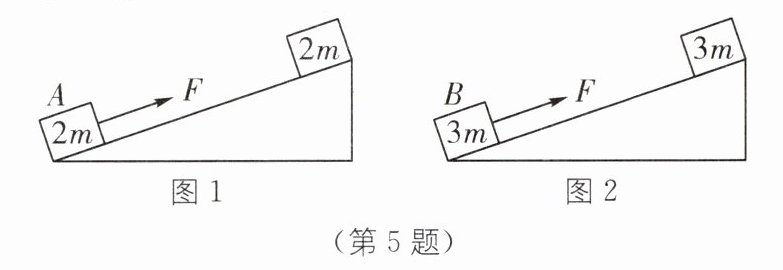 5. 实验班原创 在两个等长、等高但材质不同的斜面上,用平行于斜面且大小相等的拉力F分别将质量为2m 和3m 的A、B两物体从斜面底部匀速拉到顶端,如图所示。此过程中,图1、图2两斜面上的拉力F所做的功分别为$W_{1}$、$W_{2}$,拉力F克服重力所做的功分别为$W_{A}$、$W_{B}$。则(