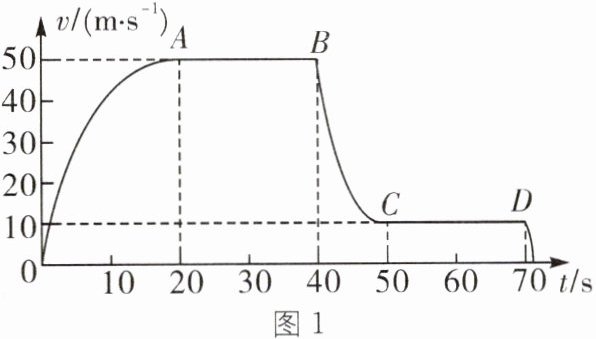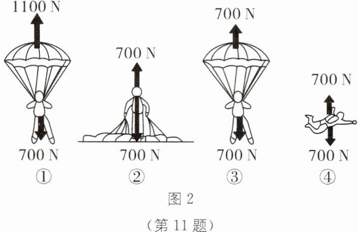 11. 图像分析法 某跳伞运动员从飞机上跳下,沿竖直方向降落,一段时间后打开降落伞,最后安全着地。已知运动员和跳伞设备的总重力为700 N,跳伞过程中下降的速度与时间的关系如图1所示。