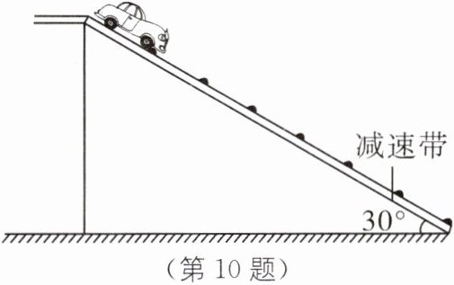 10. 跨学科 分析斜坡减速带中的运动与能量 车速过快是造成交通事故的重要原因之一,为限制车速,常常在下坡路段设置减速带。如图所示是有减速带的斜坡示意图,在倾角为30°的斜坡上有7个减速带,相邻两个减速带间的距离均为50 m。现有一辆质量为1.2 t的小汽车,从斜坡上离减速带有一定距离的某处开始下滑,由于减速带、小汽车制动等因素的影响,使得小汽车通过相邻减速带间的平均速度均为10 m/s。(小汽车的长度不计,减速带的宽度不计,g取10 N/kg)问: