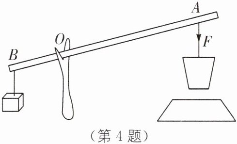 4. (2025·嘉兴平湖期末)如图所示是古人利用桔槔从井里汲水的示意图,它的前端 A 系一水桶,后端 B 系一配重物,从井中汲水时,先用力 F 往下拉将水桶放入井水中,当水桶中装水后,再用力往上提水桶。若配重质量为 4.8 kg,OA= 3OB,杆的自重不计,g 取 10 N/kg,则下列说法正确的是(
